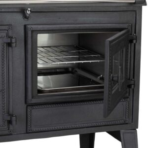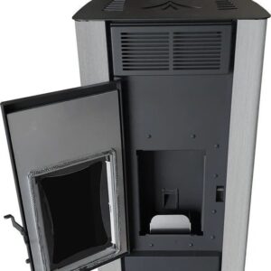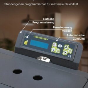 Zu den Highlights zählen 24 Wärmespeichersteine, ein großzügiges Holzlagerfach mit Tür, ein praktischer Aschekasten sowie eine Scheibenspülung, die klare Sicht auf das Flammenspiel garantiert.